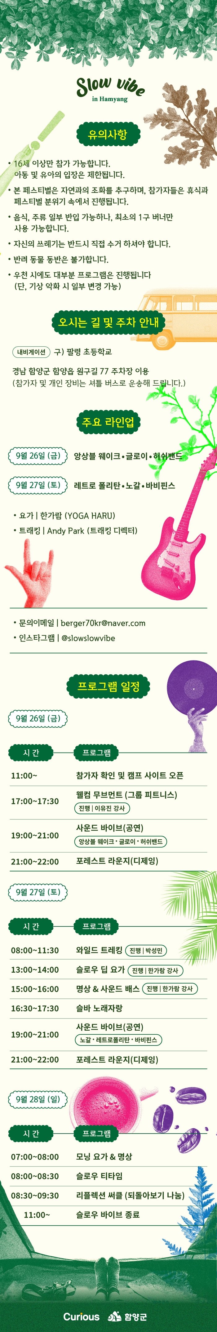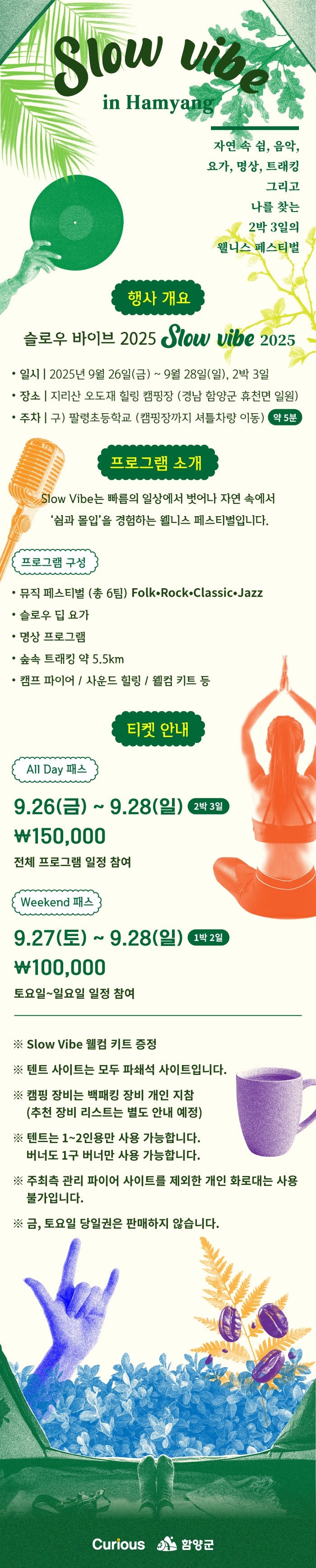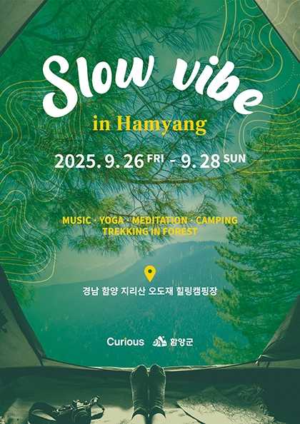 9월 26일 ~ 28일 경상남도 함양에서 진행 예정이었던 '슬로우바이브 인 함양'은 내부 사정으로 인해 취소 및 잠정 연기되었음을 안내 드립니다.