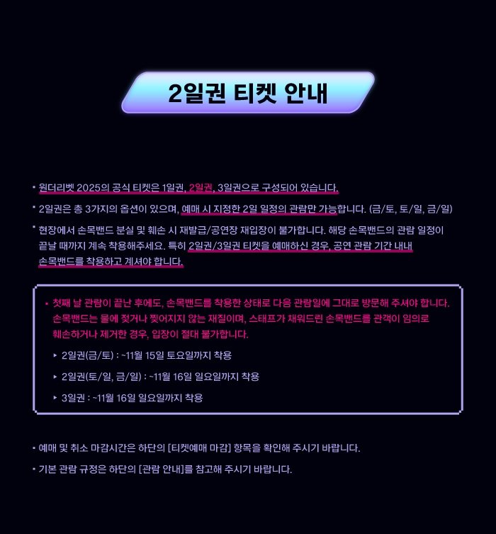 ※ 1일권, 2일권 티켓 예매자는 예매 시 지정한 날짜에만 관람할 수 있으며 구매 후 날짜 변경이 불가합니다. 취소 후 다시 예매해주세요.