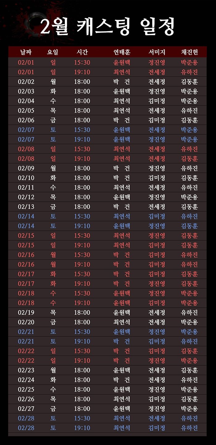 * 2/16(월) ~ 2/18(수) : 15시 30분 / 19시 10분