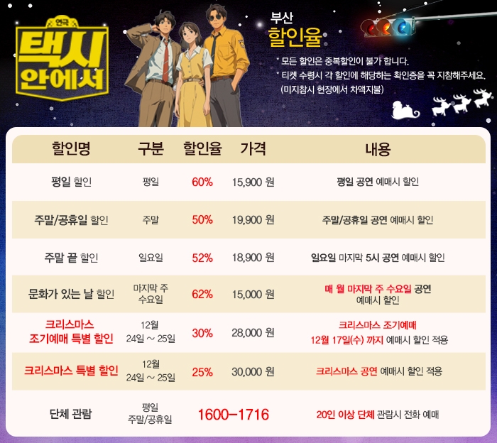 | 평일 공연 할인 (24,100원할인) | 15,900원 | |