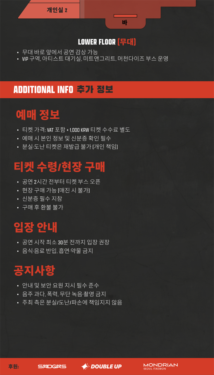 - SNS FOLLOW DISCOUNT 20% : 1인 1매 / SNS 계정 팔로우 및 SNS 스토리 공유 시 GENERAL ADMISSION, VIP ADMISSION 할인
