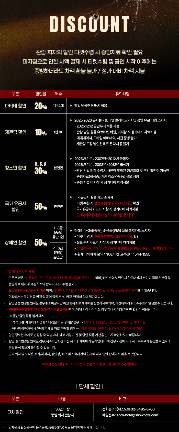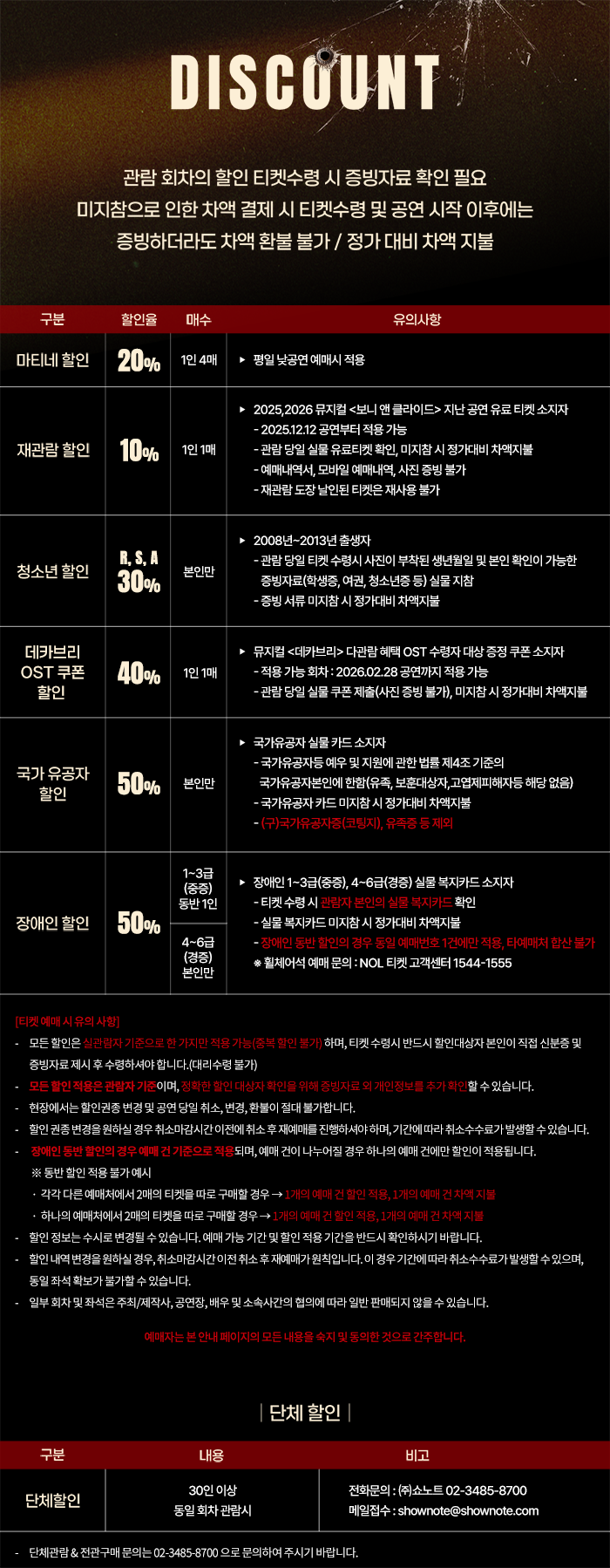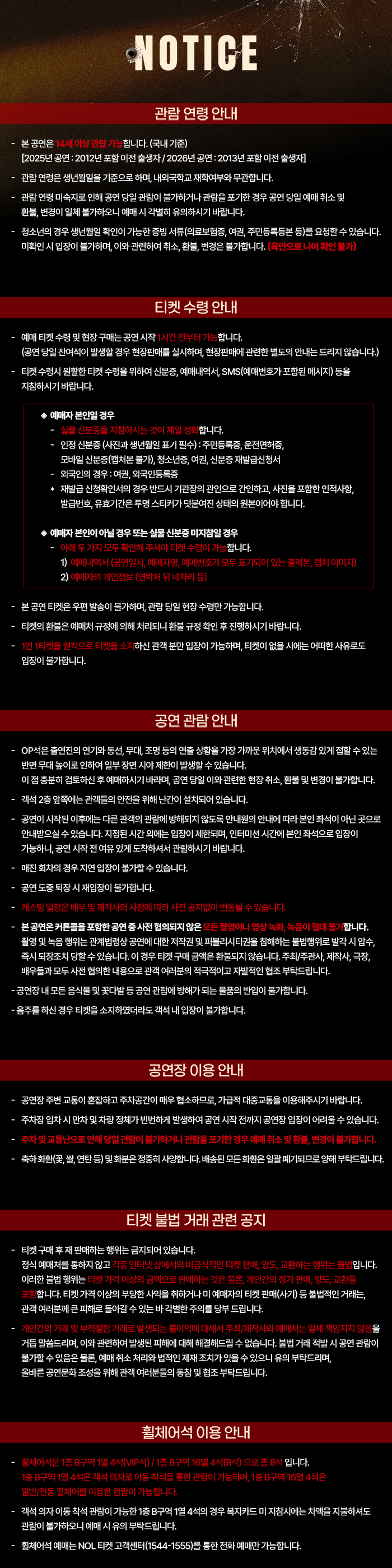 | 유효기간(이용조건) | 2025.12.11 - 2026.03.02 (예매한 공연 회차에 한해 이용가능) | ||||||||||||