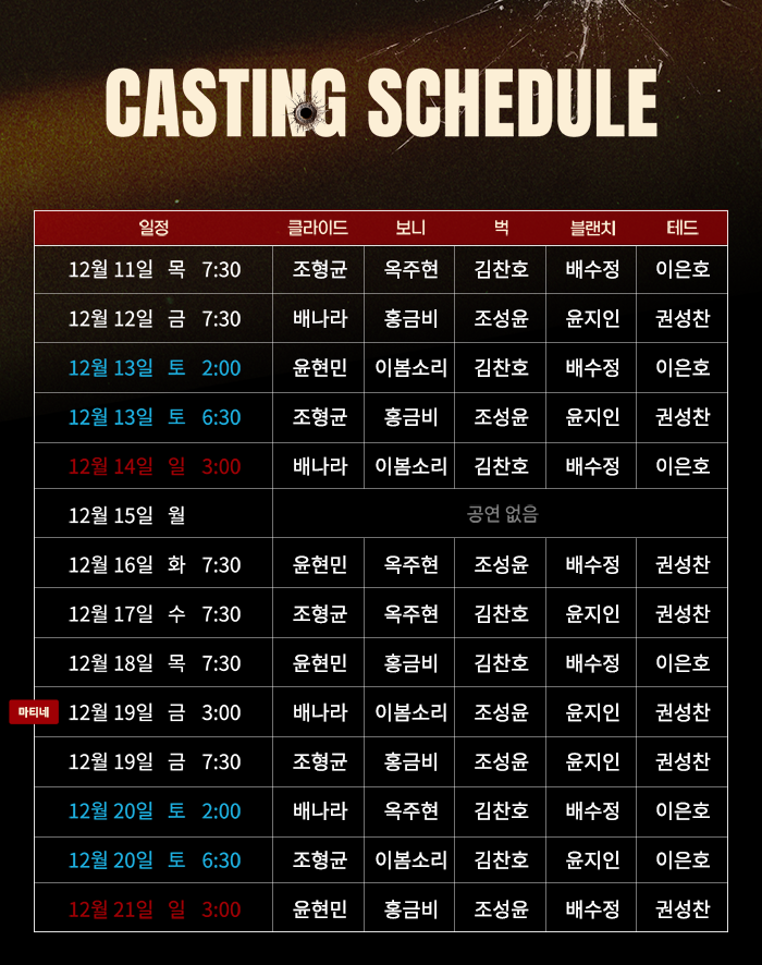 화,수,목 7시30분 / 금 3시, 7시30분 / 토 2시, 6시 30분 / 일 3시 (월 공연없음, 일자별 상이)