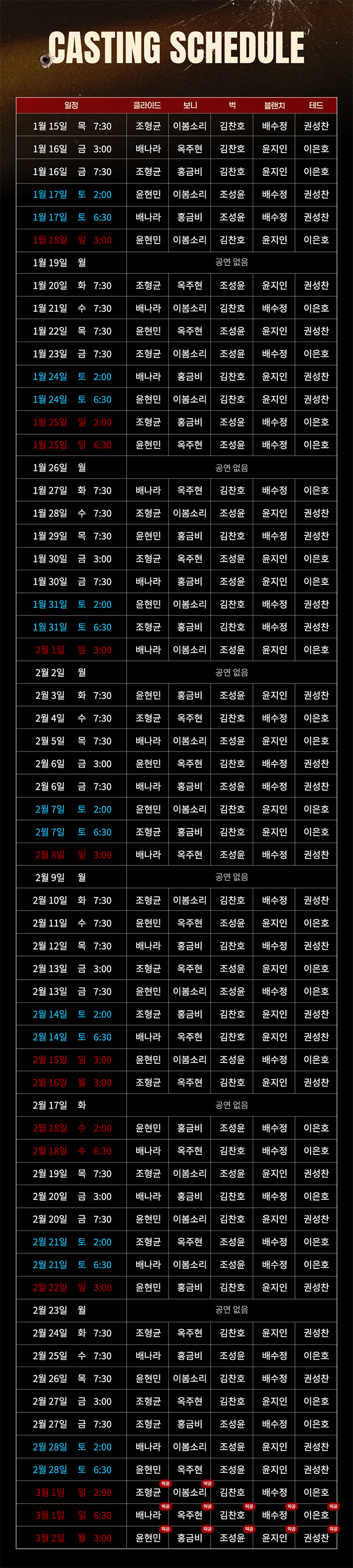 * 단, 12/25(목) 2시, 6시 30분 , 12/26(금) 1/2(금) 1/23(금) 7시 30분 , 12/28(일) 1/4(일) 1/25(일) 2시, 6시 30분, 1/1(목) 3시 공연