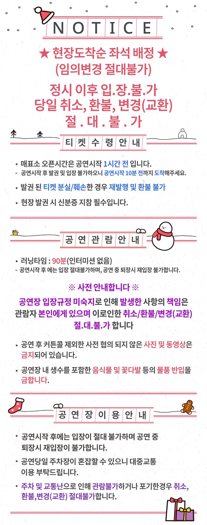 ※ 본 공연은 공연 당일 현장 도착 순으로 입장이 가능합니다. 예매 시 참고부탁드립니다.