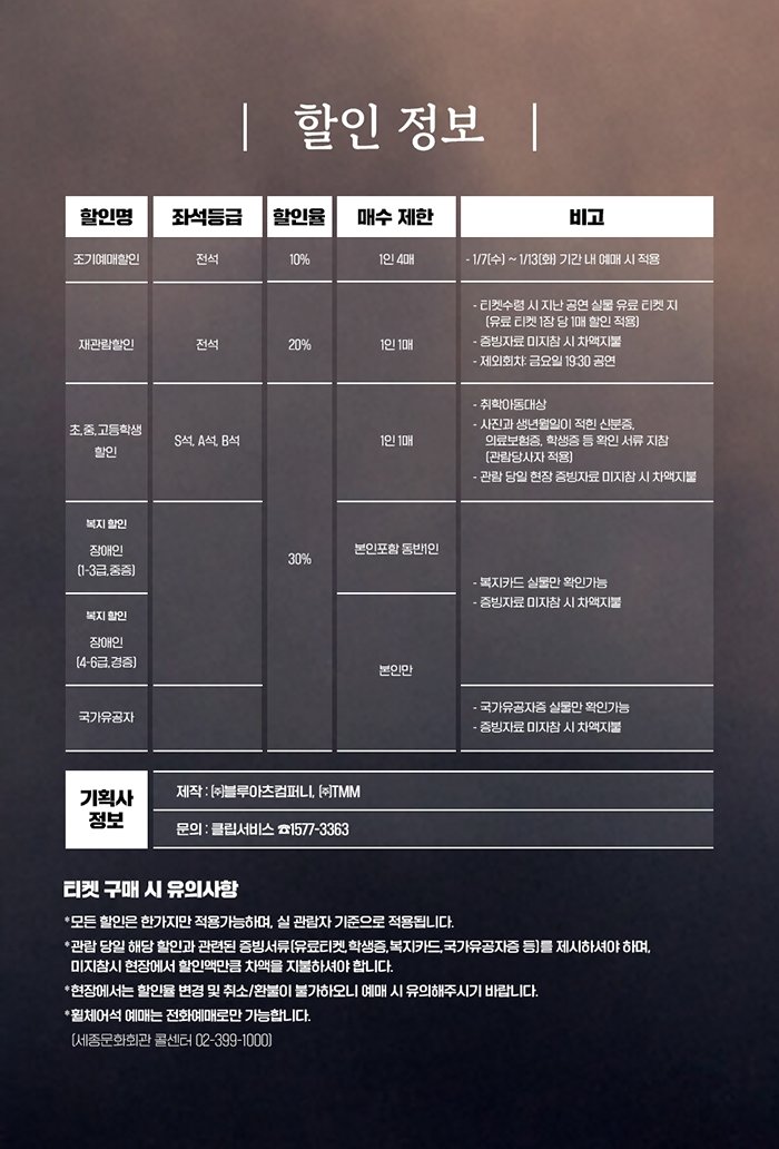 | 유효기간(이용조건) | 2026.01.30 - 2026.02.01 (예매한 공연 회차에 한해 이용가능) | ||||||||||||