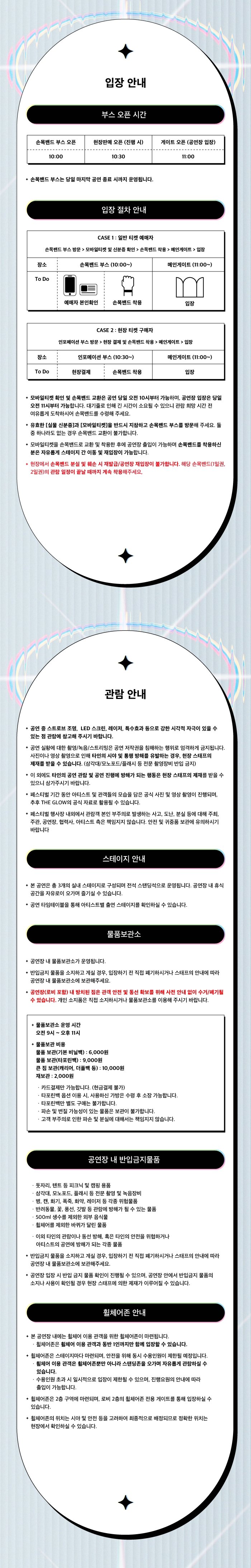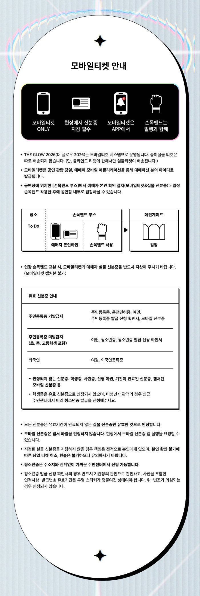 ※ 예매자는 본 페이지의 모든 내용을 숙지 및 동의한 것으로 간주하며, 본 내용은 상황에 따라 추가 및 변경될 수 있습니다. 추후 추가되는 내용은 인스타그램 공식계정 @theglowseoul 에서도 안내 예정이나, 관람 전 본 페이지 내용을 한 번 더 확인해주세요.
