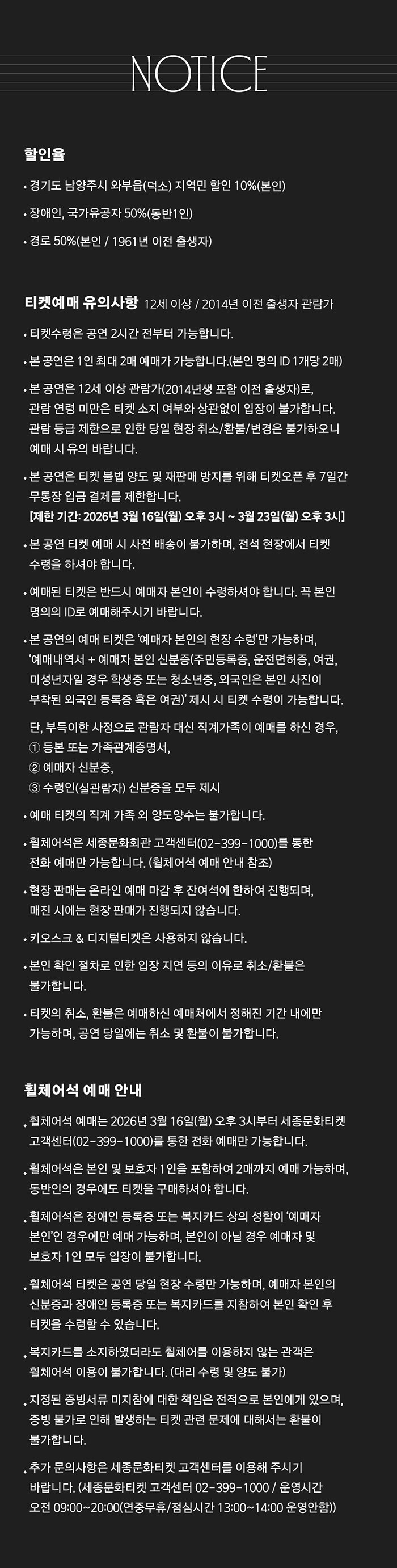 ※ 원활한 예매 진행을 위해 2026년 3월 16일(월) 오후 3시부터 3월 23일(월) 오후 3시까지 무통장 입금으로 예매가 불가함을 안내드립니다.