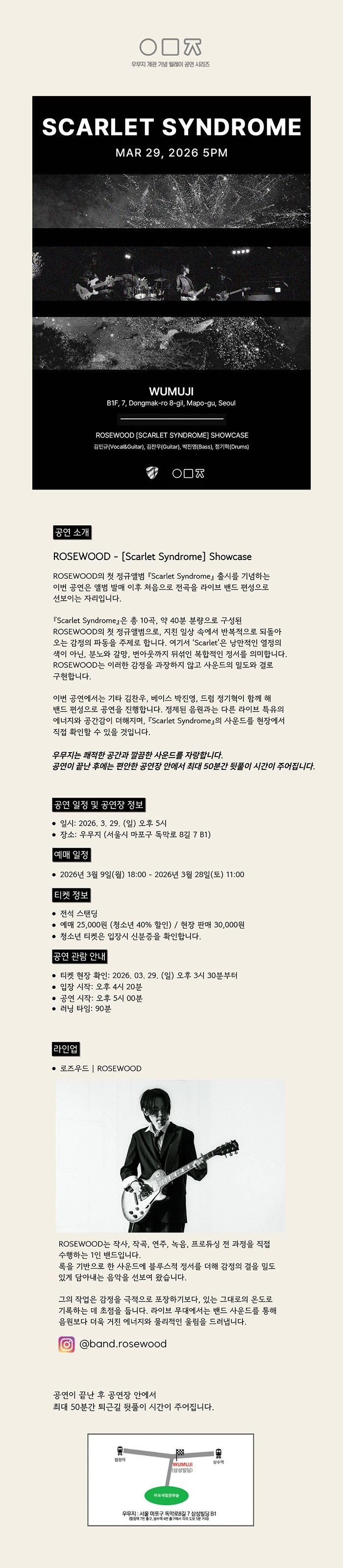 ROSEWOOD의 첫 정규앨범 『Scarlet Syndrome』 출시를 기념하는 이번 공연은 앨범 발매 이후 처음으로 전곡을 라이브 밴드 편성으로 선보이는 자리
