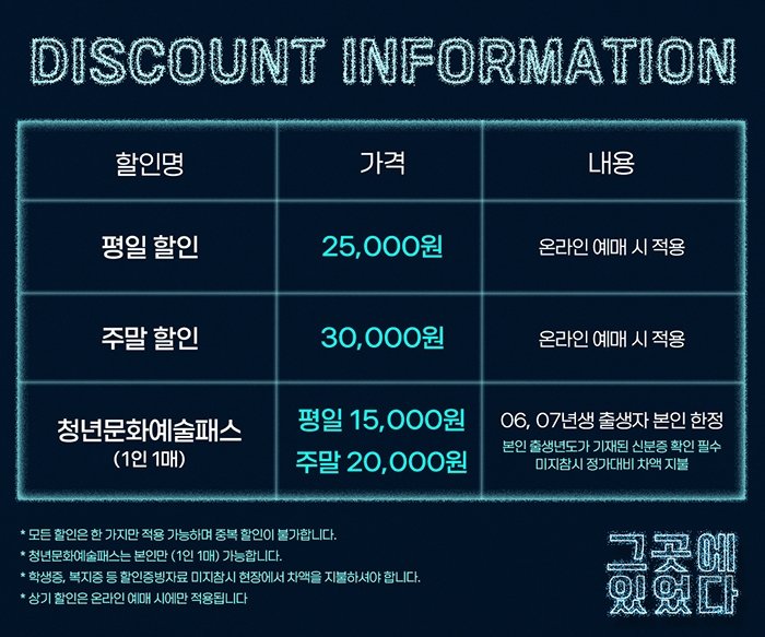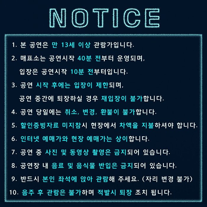 ※ 본 공연은 공연 당일 현장 도착 순으로 입장 및 착석이 가능합니다. 예매 시 참고 부탁드립니다.