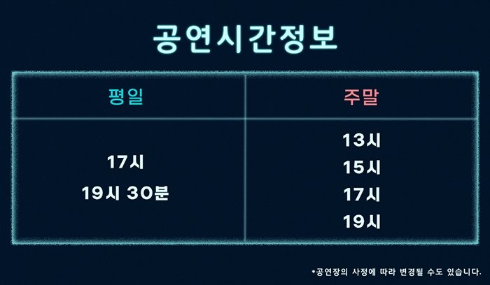 평일 17시, 19시 30분 / 주말 13시, 15시, 17시, 19시