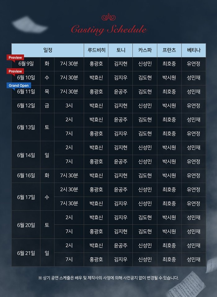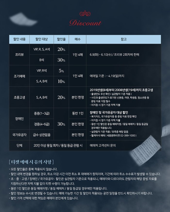 ※ 특정 날짜의 공연 시간이 다를 수 있으므로, 반드시 공연 시간을 사전에 확인하여 주시기 바랍니다.