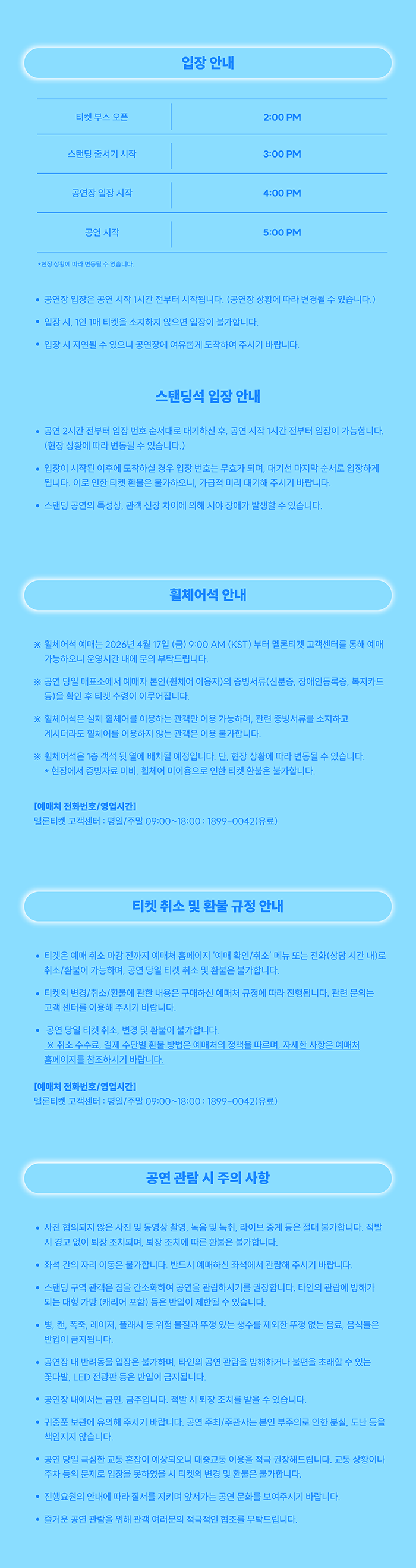 ※ 휠체어석 예매는 4월 17일(금) 오전 9시부터 멜론티켓 고객센터를 통해서만 예매 가능하오니, 예매 시 참고하시기 바랍니다.